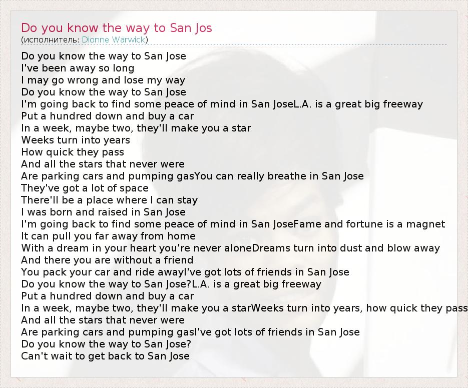 Do you know the way to San Jose I've been away so long I may go wrong and lose my way Do you know the way to San Jose I'm going back to find some peace of mind in San JoseL.A. is a great big freeway Put a hundred down and buy a car In a week, maybe two, they'll make you a star Weeks turn into years How quick they pass And all the stars that never were Are parking cars and pumping gasYou can really breathe in San Jose They've got a lot of space There'll be a place where I can stay I was born and raised in San Jose I'm going back to find some peace of mind in San JoseFame and fortune is a magnet It can pull you far away from home With a dream in your heart you're never aloneDreams turn into dust and blow away And there you are without a friend You pack your car and ride awayI've got lots of friends in San Jose Do you know the way to San Jose?L.A. is a great big freeway Put a hundred down and buy a car In a week, maybe two, they'll make you a starWeeks turn into years, how quick they pass And all the stars that never were Are parking cars and pumping gasI've got lots of friends in San Jose Do you know the way to San Jose? Can't wait to get back to San Jose