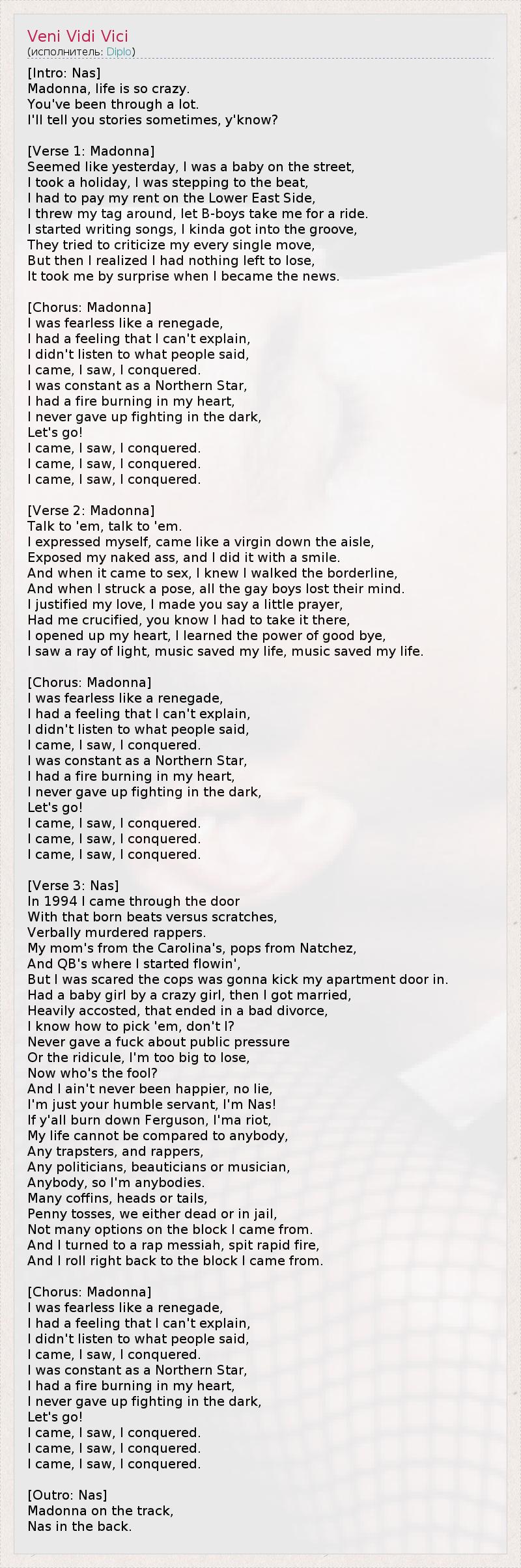 А как ты думаешь, о чем песня "Veni Vidi Vici" ?