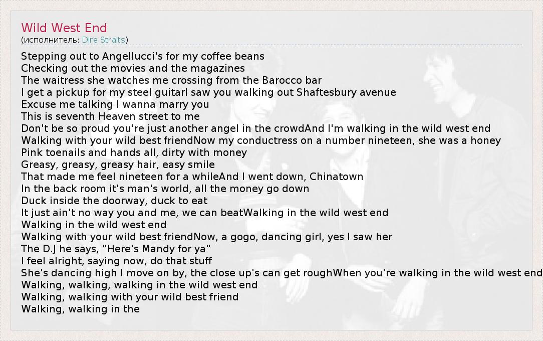 She's dancing high I move on by, the close up's can get roughWhen you're walking in the wild west end