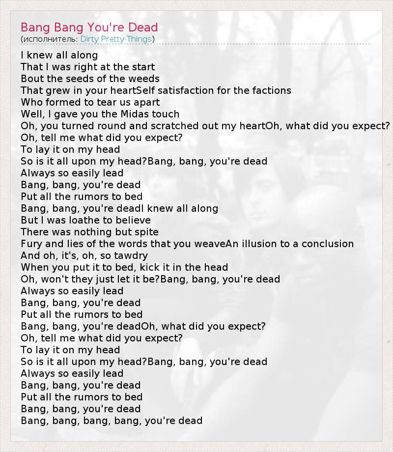 I knew all along That I was right at the start Bout the seeds of the weeds That grew in your heartSelf satisfaction for the factions Who formed to tear us apart Well, I gave you the Midas touch Oh, you turned round and scratched out my heartOh, what did you expect? Oh, tell me what did you expect? To lay it on my head So is it all upon my head?Bang, bang, you're dead Always so easily lead Bang, bang, you're dead Put all the rumors to bed Bang, bang, you're deadI knew all along But I was loathe to believe There was nothing but spite Fury and lies of the words that you weaveAn illusion to a conclusion And oh, it's, oh, so tawdry When you put it to bed, kick it in the head Oh, won't they just let it be?Bang, bang, you're dead Always so easily lead Bang, bang, you're dead Put all the rumors to bed Bang, bang, you're deadOh, what did you expect? Oh, tell me what did you expect? To lay it on my head So is it all upon my head?Bang, bang, you're dead Always so easily lead Bang, bang, you're dead Put all the rumors to bed Bang, bang, you're dead Bang, bang, bang, bang, you're dead