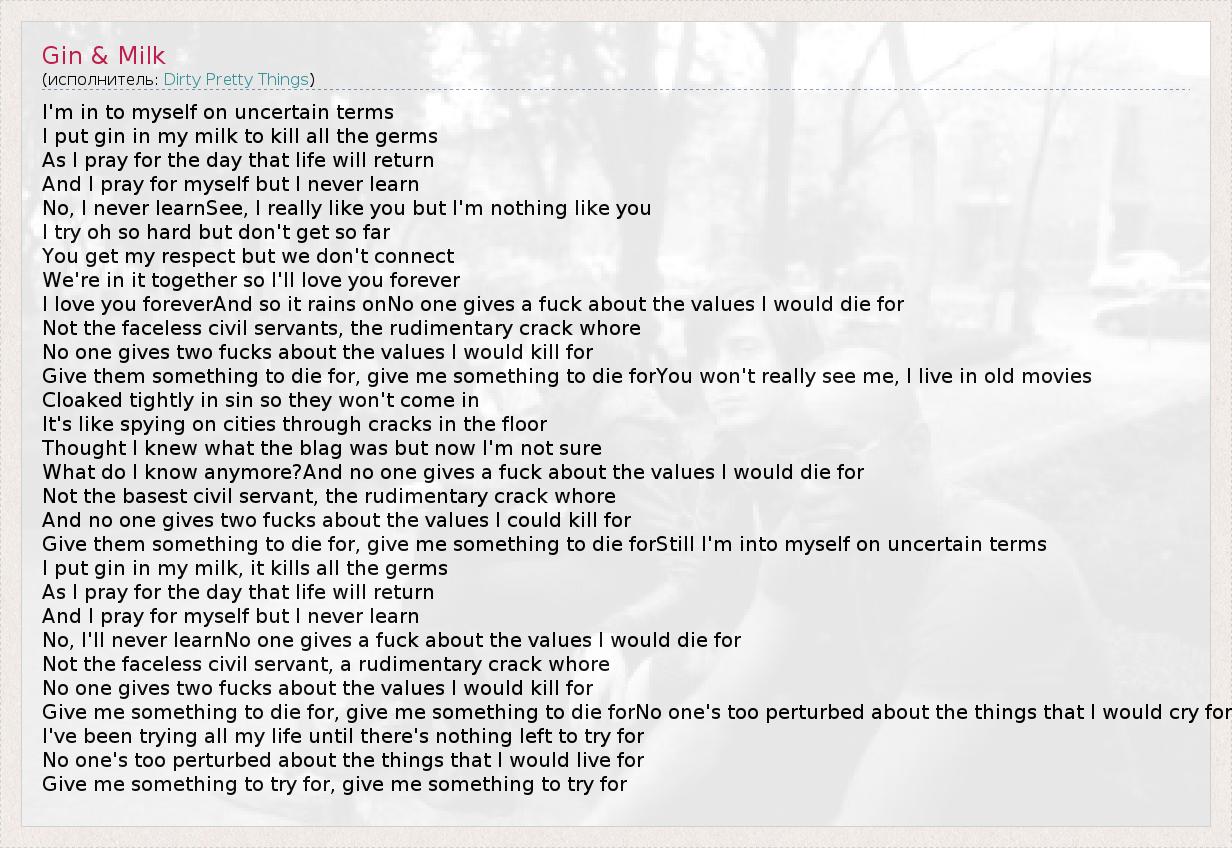 I'm in to myself on uncertain terms I put gin in my milk to kill all the germs As I pray for the day that life will return And I pray for myself but I never learn No, I never learnSee, I really like you but I'm nothing like you I try oh so hard but don't get so far You get my respect but we don't connect We're in it together so I'll love you forever I love you foreverAnd so it rains onNo one gives a fuck about the values I would die for Not the faceless civil servants, the rudimentary crack whore No one gives two fucks about the values I would kill for Give them something to die for, give me something to die forYou won't really see me, I live in old movies Cloaked tightly in sin so they won't come in It's like spying on cities through cracks in the floor Thought I knew what the blag was but now I'm not sure What do I know anymore?And no one gives a fuck about the values I would die for Not the basest civil servant, the rudimentary crack whore And no one gives two fucks about the values I could kill for Give them something to die for, give me something to die forStill I'm into myself on uncertain terms I put gin in my milk, it kills all the germs As I pray for the day that life will return And I pray for myself but I never learn No, I'll never learnNo one gives a fuck about the values I would die for Not the faceless civil servant, a rudimentary crack whore No one gives two fucks about the values I would kill for Give me something to die for, give me something to die forNo one's too perturbed about the things that I would cry for I've been trying all my life until there's nothing left to try for No one's too perturbed about the things that I would live for Give me something to try for, give me something to try for