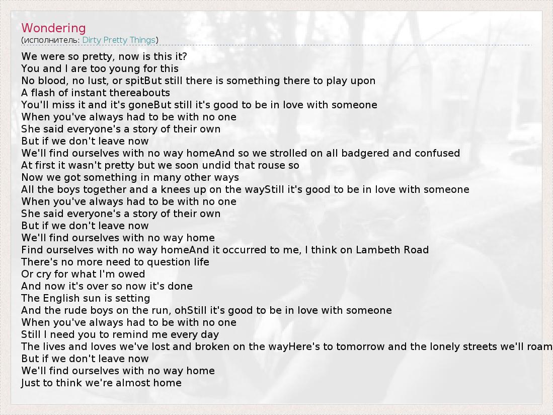 Это интересно:Dirty Pretty Things - группа Карла Барата (Carl Barat), бывшего фронтмена The Libertines. В состав группы вошли басист Cooper Temple Clause Дидз Хэммонд, гитарист Энтони Россомандо и бывший коллега Барата по все тем же The Libertines барабанщик Гэри Пауэлл.Дебютный диск группы был записан в одной из калифорнийских студий под присмотром продюсера Дэйва Сарди, ранее работавшего с Oasis и Jet. По словам Карла Барата, за две недели... продолжение