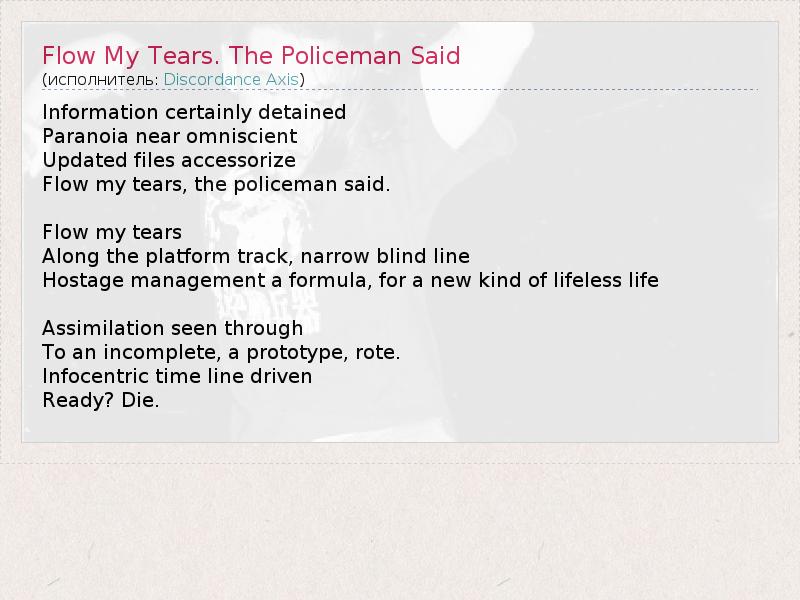 ГлавнаяИсполнителиDiscordance AxisFlow My Tears. The Policeman Said