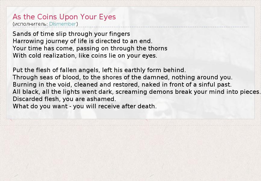 А как ты думаешь, о чем песня "As the Coins Upon Your Eyes" ?