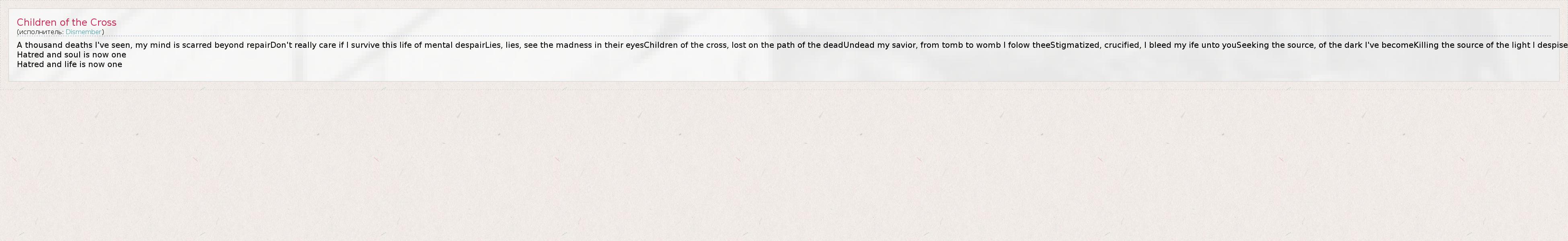 A thousand deaths I've seen, my mind is scarred beyond repairDon't really care if I survive this life of mental despairLies, lies, see the madness in their eyesChildren of the cross, lost on the path of the deadUndead my savior, from tomb to womb I folow theeStigmatized, crucified, I bleed my ife unto youSeeking the source, of the dark I've becomeKilling the source of the light I despise Hatred and soul is now one Hatred and life is now one