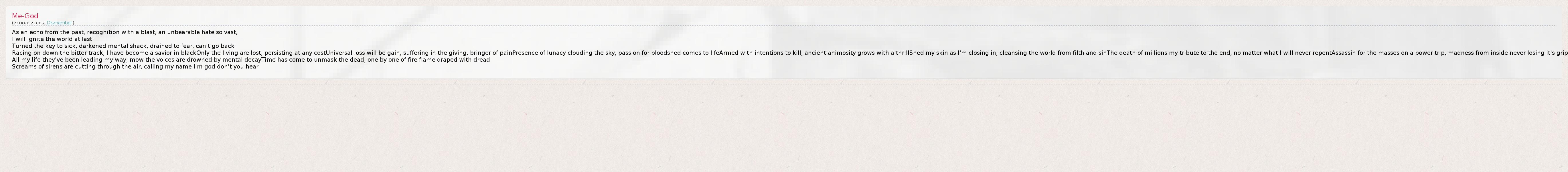 Racing on down the bitter track, I have become a savior in blackOnly the living are lost, persisting at any costUniversal loss will be gain, suffering in the giving, bringer of painPresence of lunacy clouding the sky, passion for bloodshed comes to lifeArmed with intentions to kill, ancient animosity grows with a thrillShed my skin as I'm closing in, cleansing the world from filth and sinThe death of millions my tribute to the end, no matter what I will never repentAssassin for the masses on a power trip, madness from inside never losing it's grip