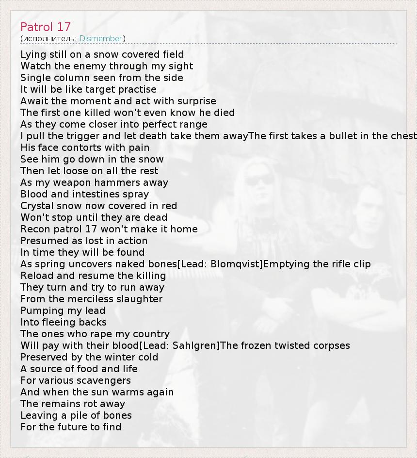 Lying still on a snow covered field Watch the enemy through my sight Single column seen from the side It will be like target practise Await the moment and act with surprise The first one killed won't even know he died As they come closer into perfect range I pull the trigger and let death take them awayThe first takes a bullet in the chest His face contorts with pain See him go down in the snow Then let loose on all the rest As my weapon hammers away Blood and intestines spray Crystal snow now covered in red Won't stop until they are dead Recon patrol 17 won't make it home Presumed as lost in action In time they will be found As spring uncovers naked bones[Lead: Blomqvist]Emptying the rifle clip Reload and resume the killing They turn and try to run away From the merciless slaughter Pumping my lead Into fleeing backs The ones who rape my country Will pay with their blood[Lead: Sahlgren]The frozen twisted corpses Preserved by the winter cold A source of food and life For various scavengers And when the sun warms again The remains rot away Leaving a pile of bones For the future to find