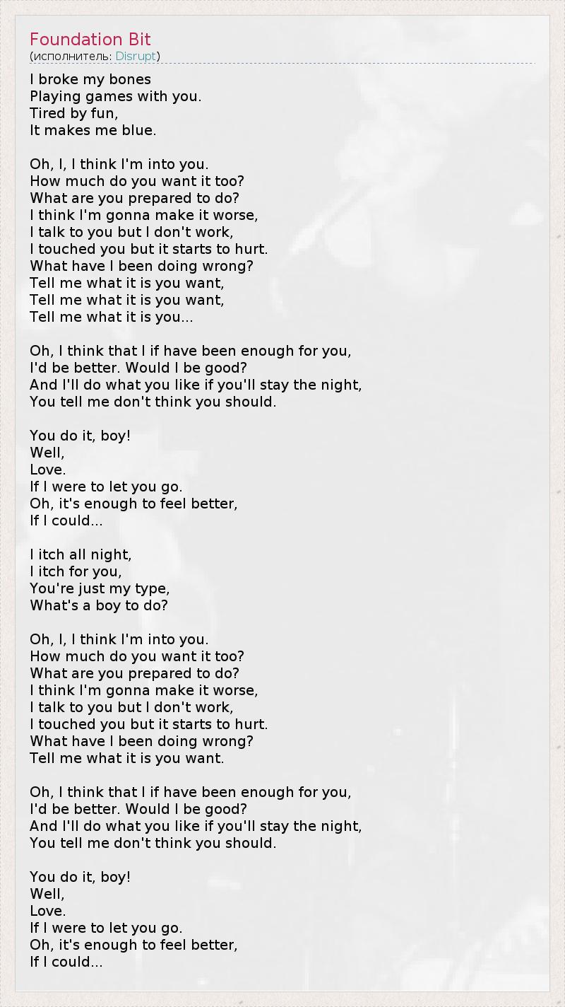 I broke my bones Playing games with you. Tired by fun, It makes me blue. Oh, I, I think I'm into you. How much do you want it too? What are you prepared to do? I think I'm gonna make it worse, I talk to you but I don't work, I touched you but it starts to hurt. What have I been doing wrong? Tell me what it is you want, Tell me what it is you want, Tell me what it is you... Oh, I think that I if have been enough for you, I'd be better. Would I be good? And I'll do what you like if you'll stay the night, You tell me don't think you should. You do it, boy! Well, Love. If I were to let you go. Oh, it's enough to feel better, If I could... I itch all night, I itch for you, You're just my type, What's a boy to do? Oh, I, I think I'm into you. How much do you want it too? What are you prepared to do? I think I'm gonna make it worse, I talk to you but I don't work, I touched you but it starts to hurt. What have I been doing wrong? Tell me what it is you want. Oh, I think that I if have been enough for you, I'd be better. Would I be good? And I'll do what you like if you'll stay the night, You tell me don't think you should. You do it, boy! Well, Love. If I were to let you go. Oh, it's enough to feel better, If I could...
