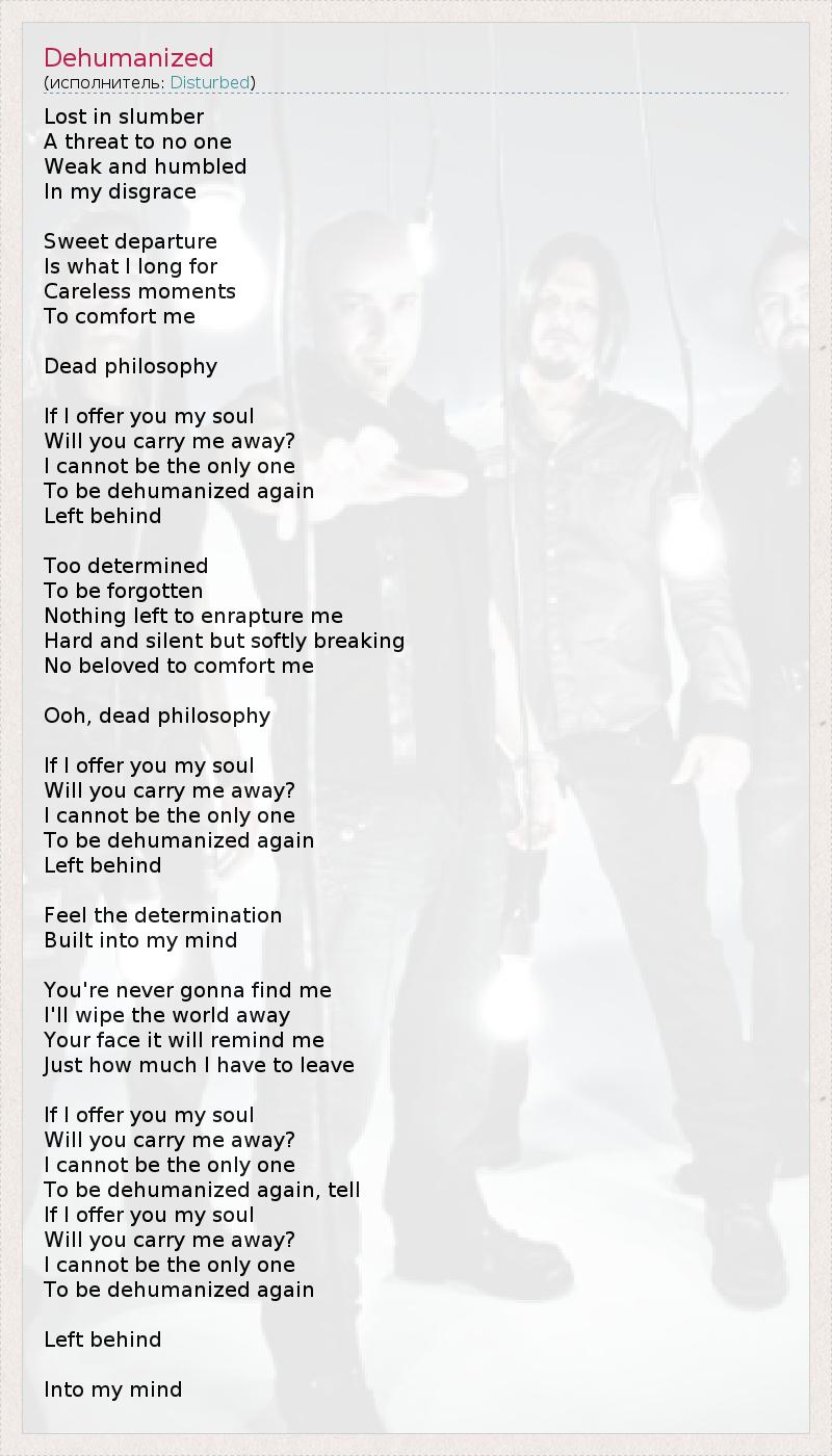 Lost in slumber A threat to no one Weak and humbled In my disgrace Sweet departure Is what I long for Careless moments To comfort me Dead philosophy If I offer you my soul Will you carry me away? I cannot be the only one To be dehumanized again Left behind Too determined To be forgotten Nothing left to enrapture me Hard and silent but softly breaking No beloved to comfort me Ooh, dead philosophy If I offer you my soul Will you carry me away? I cannot be the only one To be dehumanized again Left behind Feel the determination Built into my mind You're never gonna find me I'll wipe the world away Your face it will remind me Just how much I have to leave If I offer you my soul Will you carry me away? I cannot be the only one To be dehumanized again, tell If I offer you my soul Will you carry me away? I cannot be the only one To be dehumanized again Left behind Into my mind