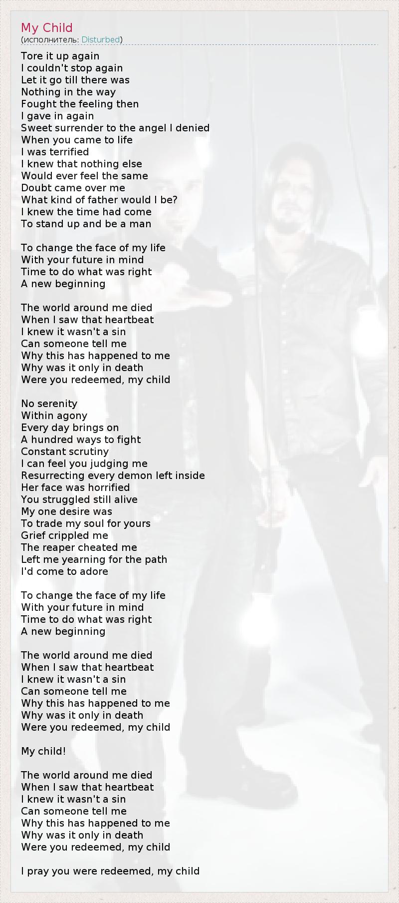 Снова чуть ли не в слезах, Снова не могу остановиться И выбрасываю мысли из головы До тех пор, пока не остаётся пустота. Боролся с эмоциями, но потом Я снова не смог устоять И с облечением сдался ангелу, которого отверг. Когда ты появился на свет, Я был ужасно испуган, Я знал, что уже ничего Не будет так, как прежде. Сомнения захлестнули меня И я думал, каким же я буду отцом. Я знал, что пришло время Смотреть в лицо судьбе и быть мужчиной. Изменить образ моей жизни, Думая о твоём будущем, Время совершать правильные дела. Новое начало. Мир вокруг меня поблек, Когда я увидел твой пульс* - Я знаю, что ты не согрешил. Так может ли кто-нибудь ответить мне, Почему это случилось со мной, И почему лишь смерть Смогла искупить тебя, дитя моё? Никакого покоя В этой агонии, Каждый новый день провоцирует Сотню новых конфликтов. Я чувствую, как ты осуждаешь меня, Воскрешая демонов внутри меня. Её лицо было перекошено от ужаса, Ты старался выжить изо всех сил, Моим единственным желанием было Отдать свою душу взамен твоей. Печаль покалечила меня, Жнец смерти обманул меня, Оставил тосковать по тому пути в жизни, Который я выбрал для себя. Изменить образ моей жизни, Думая о твоём будущем, Время совершать правильные дела. Новое начало. Мир вокруг меня поблек, Когда я увидел твой пульс - Я знаю, что ты не согрешил. Так может ли кто-нибудь ответить мне, Почему это случилось со мной, И почему лишь смерть Смогла искупить тебя, дитя моё? Моё дитя! Мир вокруг меня поблек, Когда я увидел твой пульс - Я знаю, что ты не согрешил. Так может ли кто-нибудь ответить мне, Почему это случилось со мной, И почему лишь смерть Смогла искупить тебя, дитя моё? Я молюсь о том, что ты покоишься с миром, дитя моё. *здесь имеется ввиду наблюдение за биениями сердца на экране электрокардиографа.