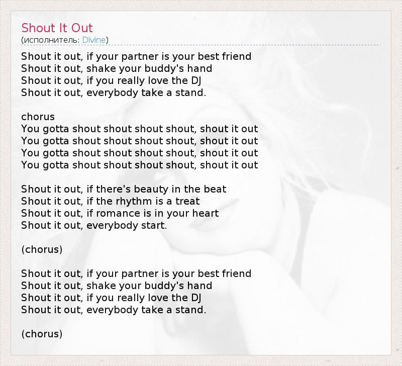 Shout it out, if your partner is your best friend Shout it out, shake your buddy's hand Shout it out, if you really love the DJ Shout it out, everybody take a stand. chorus You gotta shout shout shout shout, shout it out You gotta shout shout shout shout, shout it out You gotta shout shout shout shout, shout it out You gotta shout shout shout shout, shout it out Shout it out, if there's beauty in the beat Shout it out, if the rhythm is a treat Shout it out, if romance is in your heart Shout it out, everybody start. (chorus) Shout it out, if your partner is your best friend Shout it out, shake your buddy's hand Shout it out, if you really love the DJ Shout it out, everybody take a stand. (chorus)
