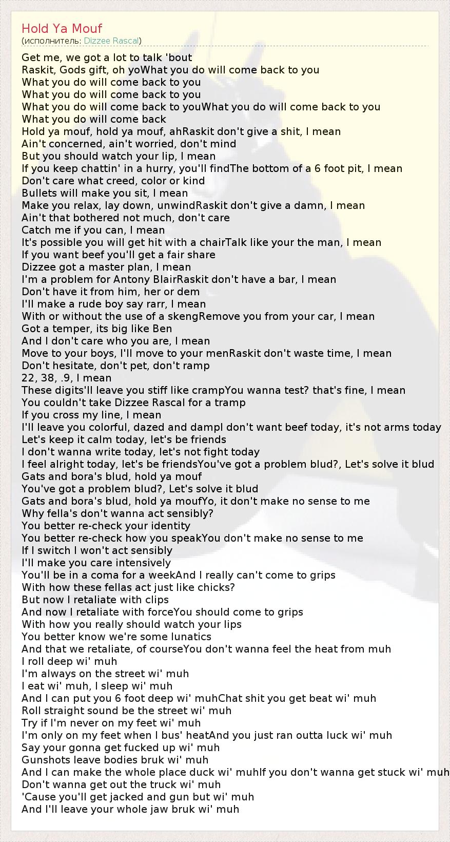 Get me, we got a lot to talk 'bout Raskit, Gods gift, oh yoWhat you do will come back to you What you do will come back to you What you do will come back to you What you do will come back to youWhat you do will come back to you What you do will come back Hold ya mouf, hold ya mouf, ahRaskit don't give a shit, I mean Ain't concerned, ain't worried, don't mind But you should watch your lip, I mean If you keep chattin' in a hurry, you'll findThe bottom of a 6 foot pit, I mean Don't care what creed, color or kind Bullets will make you sit, I mean Make you relax, lay down, unwindRaskit don't give a damn, I mean Ain't that bothered not much, don't care Catch me if you can, I mean It's possible you will get hit with a chairTalk like your the man, I mean If you want beef you'll get a fair share Dizzee got a master plan, I mean I'm a problem for Antony BlairRaskit don't have a bar, I mean Don't have it from him, her or dem I'll make a rude boy say rarr, I mean With or without the use of a skengRemove you from your car, I mean Got a temper, its big like Ben And I don't care who you are, I mean Move to your boys, I'll move to your menRaskit don't waste time, I mean Don't hesitate, don't pet, don't ramp 22, 38, .9, I mean These digits'll leave you stiff like crampYou wanna test? that's fine, I mean You couldn't take Dizzee Rascal for a tramp If you cross my line, I mean I'll leave you colorful, dazed and dampI don't want beef today, it's not arms today Let's keep it calm today, let's be friends I don't wanna write today, let's not fight today I feel alright today, let's be friendsYou've got a problem blud?, Let's solve it blud Gats and bora's blud, hold ya mouf You've got a problem blud?, Let's solve it blud Gats and bora's blud, hold ya moufYo, it don't make no sense to me Why fella's don't wanna act sensibly? You better re-check your identity You better re-check how you speakYou don't make no sense to me If I switch I won't act sensibly I'll make you care intensively You'll be in a coma for a weekAnd I really can't come to grips With how these fellas act just like chicks? But now I retaliate with clips And now I retaliate with forceYou should come to grips With how you really should watch your lips You better know we're some lunatics And that we retaliate, of courseYou don't wanna feel the heat from muh I roll deep wi' muh I'm always on the street wi' muh I eat wi' muh, I sleep wi' muh And I can put you 6 foot deep wi' muhChat shit you get beat wi' muh Roll straight sound be the street wi' muh Try if I'm never on my feet wi' muh I'm only on my feet when I bus' heatAnd you just ran outta luck wi' muh Say your gonna get fucked up wi' muh Gunshots leave bodies bruk wi' muh And I can make the whole place duck wi' muhIf you don't wanna get stuck wi' muh Don't wanna get out the truck wi' muh 'Cause you'll get jacked and gun but wi' muh And I'll leave your whole jaw bruk wi' muh