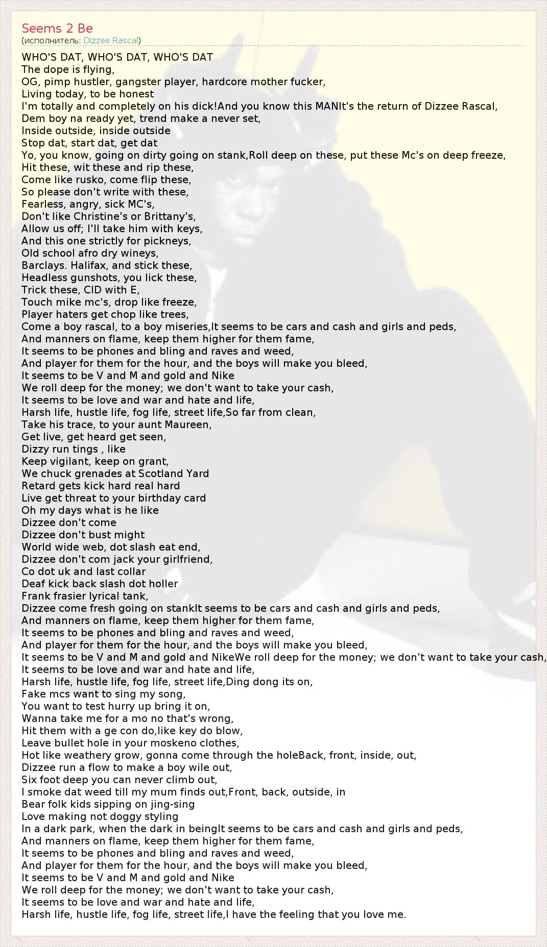 WHO'S DAT, WHO'S DAT, WHO'S DAT The dope is flying, OG, pimp hustler, gangster player, hardcore mother fucker, Living today, to be honest I'm totally and completely on his dick!And you know this MANIt's the return of Dizzee Rascal, Dem boy na ready yet, trend make a never set, Inside outside, inside outside Stop dat, start dat, get dat Yo, you know, going on dirty going on stank,Roll deep on these, put these Mc's on deep freeze, Hit these, wit these and rip these, Come like rusko, come flip these, So please don't write with these, Fearless, angry, sick MC's, Don't like Christine's or Brittany's, Allow us off; I'll take him with keys, And this one strictly for pickneys, Old school afro dry wineys, Barclays. Halifax, and stick these, Headless gunshots, you lick these, Trick these, CID with E, Touch mike mc's, drop like freeze, Player haters get chop like trees, Come a boy rascal, to a boy miseries,It seems to be cars and cash and girls and peds, And manners on flame, keep them higher for them fame, It seems to be phones and bling and raves and weed, And player for them for the hour, and the boys will make you bleed, It seems to be V and M and gold and Nike We roll deep for the money; we don't want to take your cash, It seems to be love and war and hate and life, Harsh life, hustle life, fog life, street life,So far from clean, Take his trace, to your aunt Maureen, Get live, get heard get seen, Dizzy run tings , like Keep vigilant, keep on grant, We chuck grenades at Scotland Yard Retard gets kick hard real hard Live get threat to your birthday card Oh my days what is he like Dizzee don't come Dizzee don't bust might World wide web, dot slash eat end, Dizzee don't com jack your girlfriend, Co dot uk and last collar Deaf kick back slash dot holler Frank frasier lyrical tank, Dizzee come fresh going on stankIt seems to be cars and cash and girls and peds, And manners on flame, keep them higher for them fame, It seems to be phones and bling and raves and weed, And player for them for the hour, and the boys will make you bleed, It seems to be V and M and gold and NikeWe roll deep for the money; we don't want to take your cash, It seems to be love and war and hate and life, Harsh life, hustle life, fog life, street life,Ding dong its on, Fake mcs want to sing my song, You want to test hurry up bring it on, Wanna take me for a mo no that's wrong, Hit them with a ge con do,like key do blow, Leave bullet hole in your moskeno clothes, Hot like weathery grow, gonna come through the holeBack, front, inside, out, Dizzee run a flow to make a boy wile out, Six foot deep you can never climb out, I smoke dat weed till my mum finds out,Front, back, outside, in Bear folk kids sipping on jing-sing Love making not doggy styling In a dark park, when the dark in beingIt seems to be cars and cash and girls and peds, And manners on flame, keep them higher for them fame, It seems to be phones and bling and raves and weed, And player for them for the hour, and the boys will make you bleed, It seems to be V and M and gold and Nike We roll deep for the money; we don't want to take your cash, It seems to be love and war and hate and life, Harsh life, hustle life, fog life, street life,I have the feeling that you love me.