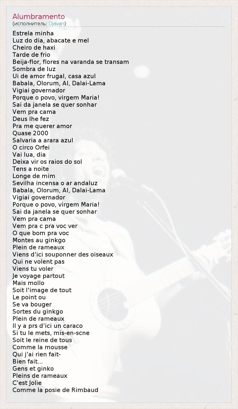 Это интересно:Джаван (Djavan) родился 27 января 1942 года в бедной семье в городе Масейо, в штате Алагоас на северо-востоке Бразилии. Как и многие бразильцы, Джаван пишет на стыке стилей - МРВ, фанк, джаз, босса-нова, афро-музыка. В юности Джаван основал группу "Luz, Som, Dimensao" (сокращенно LSD; Свет, Звук, Размерность), исполняющую каверы песен Битлс. Приехав в Рио в 1973 году, он начал работать эстрадным исполнителем... продолжение