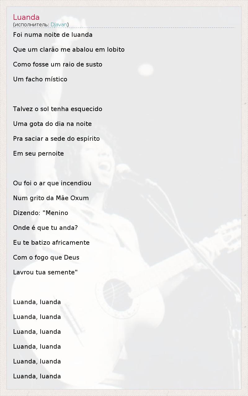 Это интересно:Джаван (Djavan) родился 27 января 1942 года в бедной семье в городе Масейо, в штате Алагоас на северо-востоке Бразилии. Как и многие бразильцы, Джаван пишет на стыке стилей - МРВ, фанк, джаз, босса-нова, афро-музыка. В юности Джаван основал группу "Luz, Som, Dimensao" (сокращенно LSD; Свет, Звук, Размерность), исполняющую каверы песен Битлс. Приехав в Рио в 1973 году, он начал работать эстрадным исполнителем... продолжение