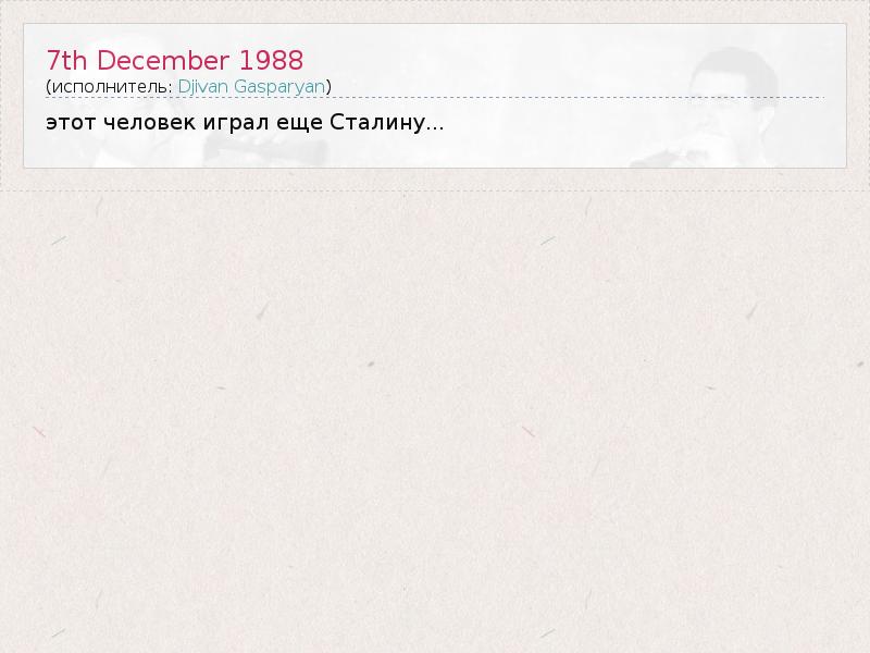 Это интересно:Джива́н Гаспаря́н (арм. Ջիվան Գասպարյան) (р. 1928, деревня Солаг, Армения) — знаменитый армянский музыкант и композитор.В раннем детстве впервые взял в руки дудук и с тех пор с ним не расставался. "Мне было лет шесть, - вспоминает он. - У меня рано умерла мама, а отец в это время был в армии. Мы жили очень бедно. Как-то раз я услышал, как играют на дудуке настоящие музыканты, и попросил дать... продолжение