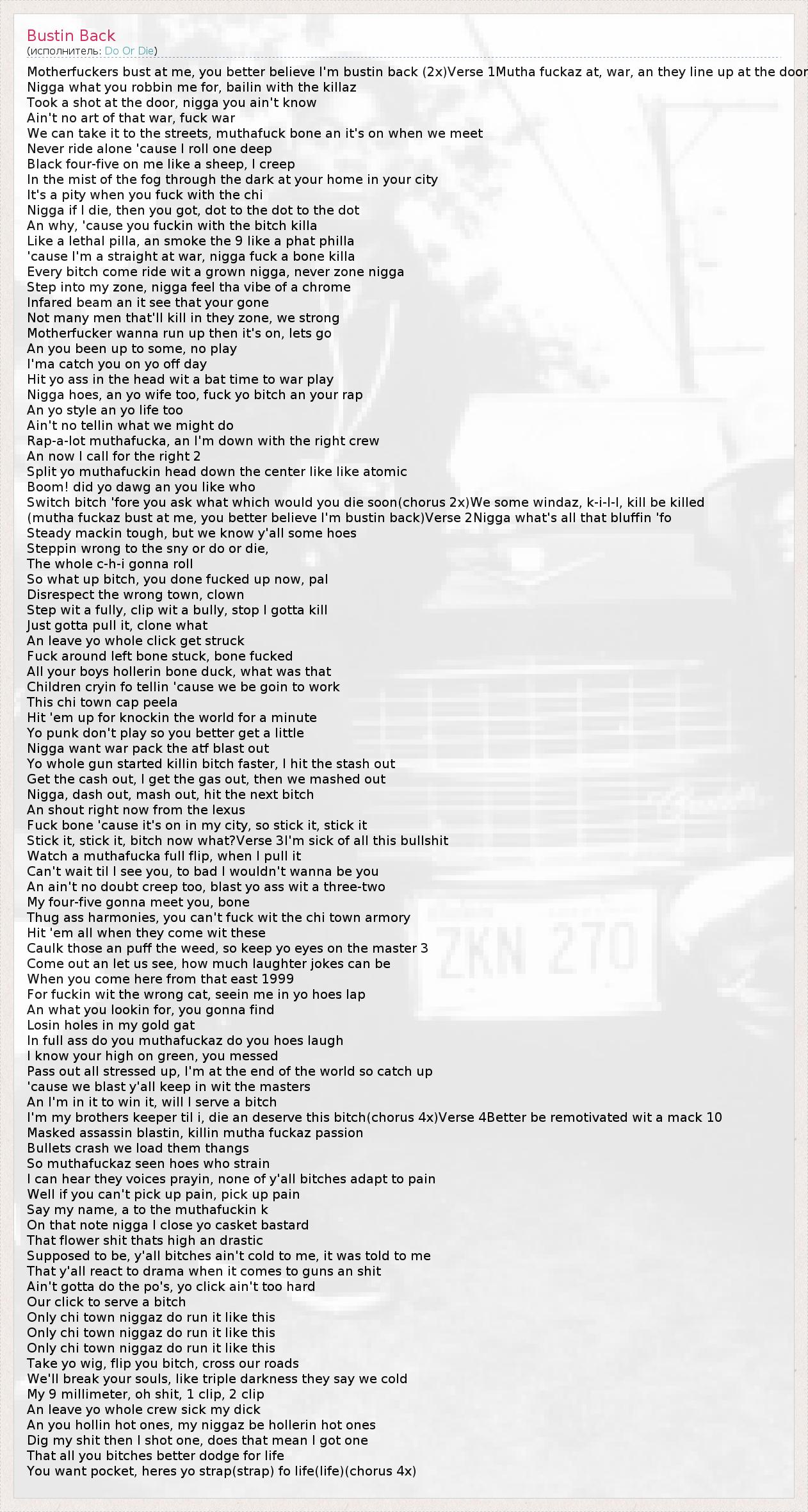 Motherfuckers bust at me, you better believe I'm bustin back (2x)Verse 1Mutha fuckaz at, war, an they line up at the door