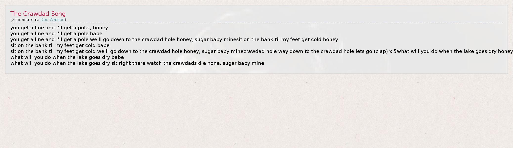 sit on the bank til my feet get cold we'll go down to the crawdad hole honey, sugar baby minecrawdad hole way down to the crawdad hole lets go (clap) x 5what will you do when the lake goes dry honey