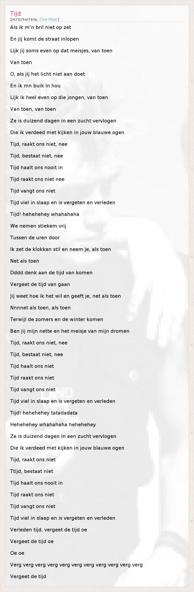 Als ik m'n bril niet op zet En jij komt de straat inlopen Lijk jij soms even op dat meisjes, van toen Van toen O, als jij het licht niet aan doet En ik mn buik in hou Lijk ik heel even op die jongen, van toen Van toen, van toen Ze is duizend dagen in een zucht vervlogen Die ik verdeed met kijken in jouw blauwe ogen Tijd, raakt ons niet, nee Tijd, bestaat niet, nee Tijd haalt ons nooit in Tijd raakt ons niet nee Tijd vangt ons niet Tijd viel in slaap en is vergeten en verleden Tijd! hehehehey whahahaha We nemen stiekem vrij Tussen de uren door Ik zet de klokken stil en neem je, als toen Net als toen Dddd denk aan de tijd van komen Vergeet de tijd van gaan Jij weet hoe ik het wil en geeft je, net als toen Nnnnet als toen, als toen Terwijl de zomers en de winter komen Ben jij mijn nette en het meisje van mijn dromen Tijd, raakt ons niet, nee Tijd, bestaat niet, nee Tijd haalt ons niet Tijd raakt ons niet Tijd vangt ons niet Tijd viel in slaap en is vergeten en verleden Tijd! hehehehey tatadadata Hehehehey whahahaha hehehehey Ze is duizend dagen in een zucht vervlogen Die ik verdeed met kijken in jouw blauwe ogen Tijd, raakt ons niet Ttijd, bestaat niet Tijd haalt ons nooit in Tijd raakt ons niet Tijd vangt ons niet Tijd viel in slaap en is vergeten en verleden Verleden tijd, vergeet de tijd oe Vergeet de tijd oe Oe oe Verg verg verg verg verg verg verg verg verg verg verg Vergeet de tijd