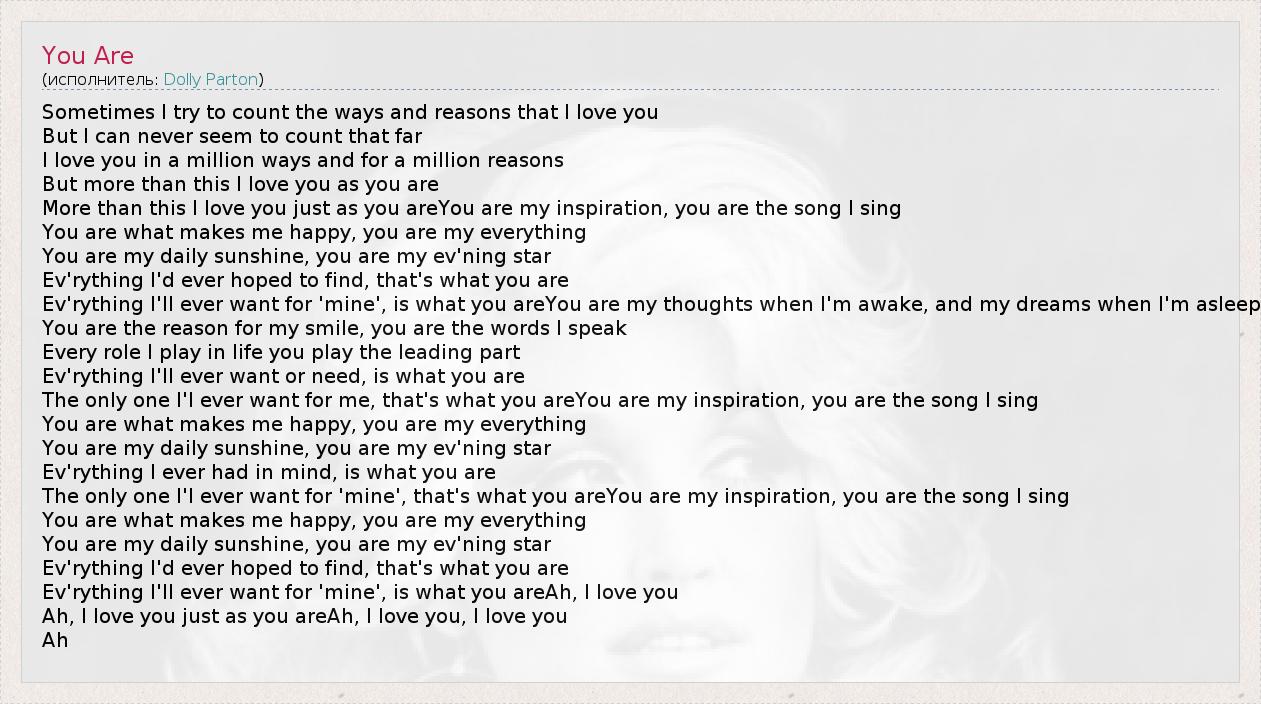 Это интересно:Долли родилась в сельской местности (штат Теннесси) в семье из двенадцати детей (её сестра Стелла — известная певица). В двадцать лет вышла замуж, имеет пятеро детей. Сначала писала песни для популярных кантри-исполнителей, а в 1967 г. вышел её первый альбом «Hello I’m Dolly». Затем в течение нескольких лет выступала в дуэте с Робертом Вагонером.В 1971 г. Долли привлекла всеобщее внимание с альбомом... продолжение