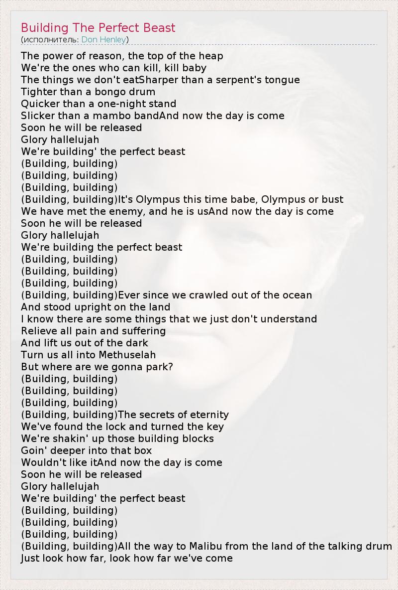 The power of reason, the top of the heap We're the ones who can kill, kill baby The things we don't eatSharper than a serpent's tongue Tighter than a bongo drum Quicker than a one-night stand Slicker than a mambo bandAnd now the day is come Soon he will be released Glory hallelujah We're building' the perfect beast (Building, building) (Building, building) (Building, building) (Building, building)It's Olympus this time babe, Olympus or bust We have met the enemy, and he is usAnd now the day is come Soon he will be released Glory hallelujah We're building the perfect beast (Building, building) (Building, building) (Building, building) (Building, building)Ever since we crawled out of the ocean And stood upright on the land I know there are some things that we just don't understand Relieve all pain and suffering And lift us out of the dark Turn us all into Methuselah But where are we gonna park? (Building, building) (Building, building) (Building, building) (Building, building)The secrets of eternity We've found the lock and turned the key We're shakin' up those building blocks Goin' deeper into that box Wouldn't like itAnd now the day is come Soon he will be released Glory hallelujah We're building' the perfect beast (Building, building) (Building, building) (Building, building) (Building, building)All the way to Malibu from the land of the talking drum Just look how far, look how far we've come