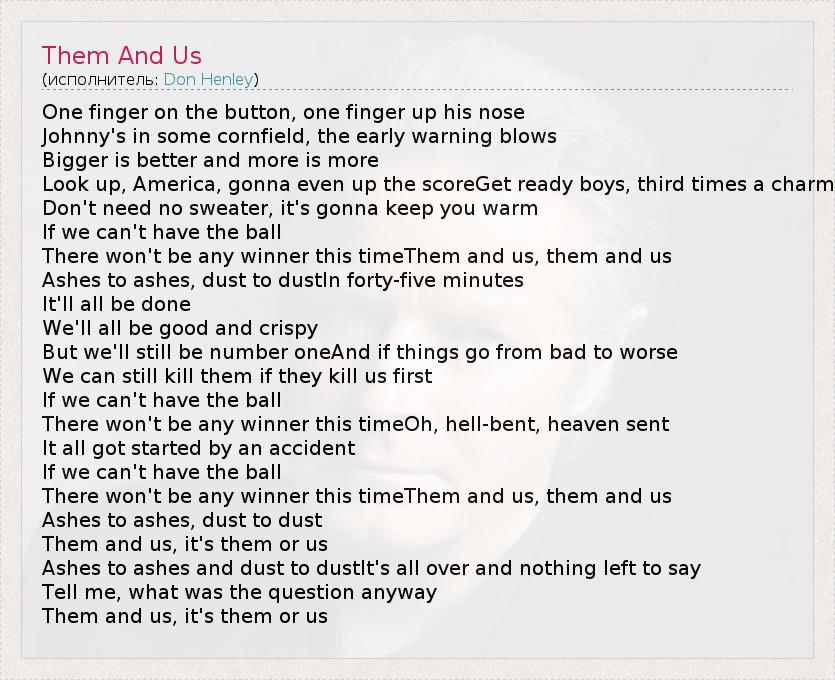 One finger on the button, one finger up his nose Johnny's in some cornfield, the early warning blows Bigger is better and more is more Look up, America, gonna even up the scoreGet ready boys, third times a charm Don't need no sweater, it's gonna keep you warm If we can't have the ball There won't be any winner this timeThem and us, them and us Ashes to ashes, dust to dustIn forty-five minutes It'll all be done We'll all be good and crispy But we'll still be number oneAnd if things go from bad to worse We can still kill them if they kill us first If we can't have the ball There won't be any winner this timeOh, hell-bent, heaven sent It all got started by an accident If we can't have the ball There won't be any winner this timeThem and us, them and us Ashes to ashes, dust to dust Them and us, it's them or us Ashes to ashes and dust to dustIt's all over and nothing left to say Tell me, what was the question anyway Them and us, it's them or us