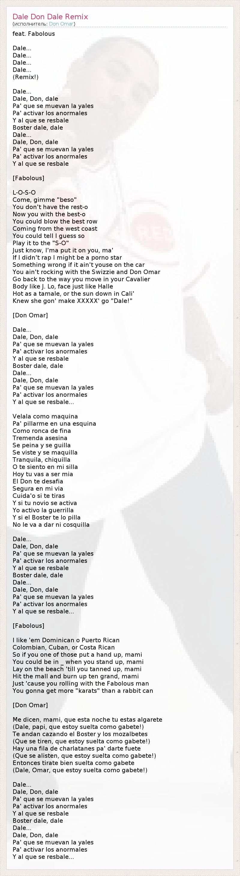 feat. Fabolous Dale... Dale... Dale... Dale... (Remix!) Dale... Dale, Don, dale Pa' que se muevan la yales Pa' activar los anormales Y al que se resbale Boster dale, dale Dale... Dale, Don, dale Pa' que se muevan la yales Pa' activar los anormales Y al que se resbale [Fabolous] L-O-S-O Come, gimme "beso" You don't have the rest-o Now you with the best-o You could blow the best row Coming from the west coast You could tell I guess so Play it to the "S-O" Just know, I'ma put it on you, ma' If I didn't rap I might be a porno star Something wrong if it ain't youse on the car You ain't rocking with the Swizzie and Don Omar Go back to the way you move in your Cavalier Body like J. Lo, face just like Halle Hot as a tamale, or the sun down in Cali' Knew she gon' make XXXXX' go "Dale!" [Don Omar] Dale... Dale, Don, dale Pa' que se muevan la yales Pa' activar los anormales Y al que se resbale Boster dale, dale Dale... Dale, Don, dale Pa' que se muevan la yales Pa' activar los anormales Y al que se resbale... Velala como maquina Pa' pillarme en una esquina Como ronca de fina Tremenda asesina Se peina y se guilla Se viste y se maquilla Tranquila, chiquilla O te siento en mi silla Hoy tu vas a ser mia El Don te desafia Segura en mi via Cuida'o si te tiras Y si tu novio se activa Yo activo la guerrilla Y si el Boster te lo pilla No le va a dar ni cosquilla Dale... Dale, Don, dale Pa' que se muevan la yales Pa' activar los anormales Y al que se resbale Boster dale, dale Dale... Dale, Don, dale Pa' que se muevan la yales Pa' activar los anormales Y al que se resbale... [Fabolous] I like 'em Dominican o Puerto Rican Colombian, Cuban, or Costa Rican So if you one of those put a hand up, mami You could be in _ when you stand up, mami Lay on the beach 'till you tanned up, mami Hit the mall and burn up ten grand, mami Just 'cause you rolling with the Fabolous man You gonna get more "karats" than a rabbit can [Don Omar] Me dicen, mami, que esta noche tu estas algarete (Dale, papi, que estoy suelta como gabete!) Te andan cazando el Boster y los mozalbetes (Que se tiren, que estoy suelta como gabete!) Hay una fila de charlatanes pa' darte fuete (Que se alisten, que estoy suelta como gabete!) Entonces tirate bien suelta como gabete (Dale, Omar, que estoy suelta como gabete!) Dale... Dale, Don, dale Pa' que se muevan la yales Pa' activar los anormales Y al que se resbale Boster dale, dale Dale... Dale, Don, dale Pa' que se muevan la yales Pa' activar los anormales Y al que se resbale...
