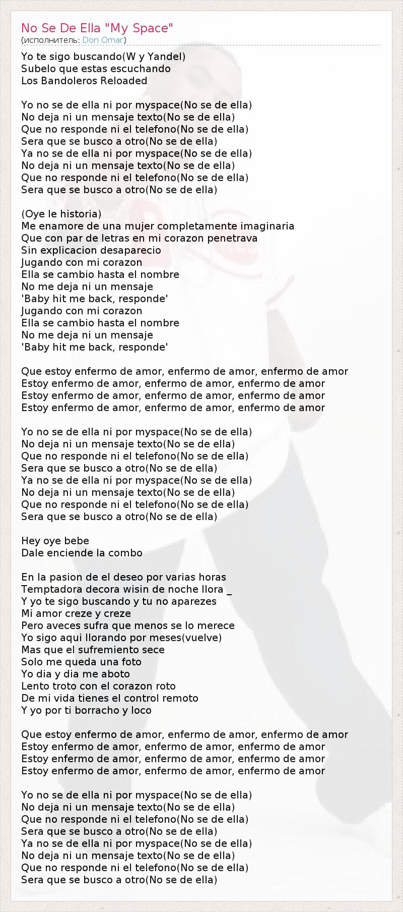 Yo te sigo buscando(W y Yandel) Subelo que estas escuchando Los Bandoleros Reloaded Yo no se de ella ni por myspace(No se de ella) No deja ni un mensaje texto(No se de ella) Que no responde ni el telefono(No se de ella) Sera que se busco a otro(No se de ella) Ya no se de ella ni por myspace(No se de ella) No deja ni un mensaje texto(No se de ella) Que no responde ni el telefono(No se de ella) Sera que se busco a otro(No se de ella) (Oye le historia) Me enamore de una mujer completamente imaginaria Que con par de letras en mi corazon penetrava Sin explicacion desaparecio Jugando con mi corazon Ella se cambio hasta el nombre No me deja ni un mensaje 'Baby hit me back, responde' Jugando con mi corazon Ella se cambio hasta el nombre No me deja ni un mensaje 'Baby hit me back, responde' Que estoy enfermo de amor, enfermo de amor, enfermo de amor Estoy enfermo de amor, enfermo de amor, enfermo de amor Estoy enfermo de amor, enfermo de amor, enfermo de amor Estoy enfermo de amor, enfermo de amor, enfermo de amor Yo no se de ella ni por myspace(No se de ella) No deja ni un mensaje texto(No se de ella) Que no responde ni el telefono(No se de ella) Sera que se busco a otro(No se de ella) Ya no se de ella ni por myspace(No se de ella) No deja ni un mensaje texto(No se de ella) Que no responde ni el telefono(No se de ella) Sera que se busco a otro(No se de ella) Hey oye bebe Dale enciende la combo En la pasion de el deseo por varias horas Temptadora decora wisin de noche llora _ Y yo te sigo buscando y tu no aparezes Mi amor creze y creze Pero aveces sufra que menos se lo merece Yo sigo aqui llorando por meses(vuelve) Mas que el sufremiento sece Solo me queda una foto Yo dia y dia me aboto Lento troto con el corazon roto De mi vida tienes el control remoto Y yo por ti borracho y loco Que estoy enfermo de amor, enfermo de amor, enfermo de amor Estoy enfermo de amor, enfermo de amor, enfermo de amor Estoy enfermo de amor, enfermo de amor, enfermo de amor Estoy enfermo de amor, enfermo de amor, enfermo de amor Yo no se de ella ni por myspace(No se de ella) No deja ni un mensaje texto(No se de ella) Que no responde ni el telefono(No se de ella) Sera que se busco a otro(No se de ella) Ya no se de ella ni por myspace(No se de ella) No deja ni un mensaje texto(No se de ella) Que no responde ni el telefono(No se de ella) Sera que se busco a otro(No se de ella)