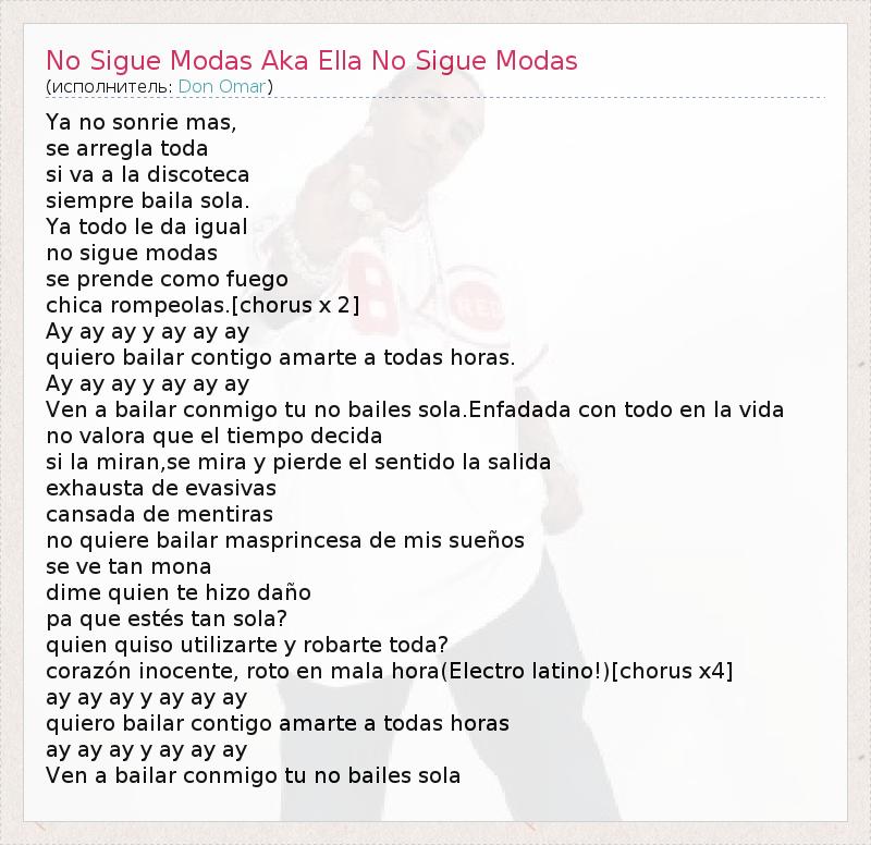 ГлавнаяИсполнителиDon OmarNo Sigue Modas Aka Ella No Sigue Modas