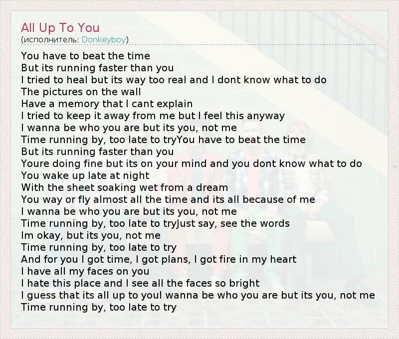 You have to beat the time But its running faster than you I tried to heal but its way too real and I dont know what to do The pictures on the wall Have a memory that I cant explain I tried to keep it away from me but I feel this anyway I wanna be who you are but its you, not me Time running by, too late to tryYou have to beat the time But its running faster than you Youre doing fine but its on your mind and you dont know what to do You wake up late at night With the sheet soaking wet from a dream You way or fly almost all the time and its all because of me I wanna be who you are but its you, not me Time running by, too late to tryJust say, see the words Im okay, but its you, not me Time running by, too late to try And for you I got time, I got plans, I got fire in my heart I have all my faces on you I hate this place and I see all the faces so bright I guess that its all up to youI wanna be who you are but its you, not me Time running by, too late to try