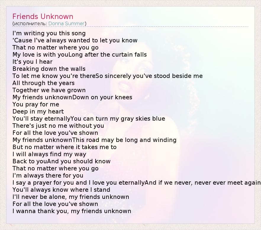 А как ты думаешь, о чем песня "Friends Unknown" ?