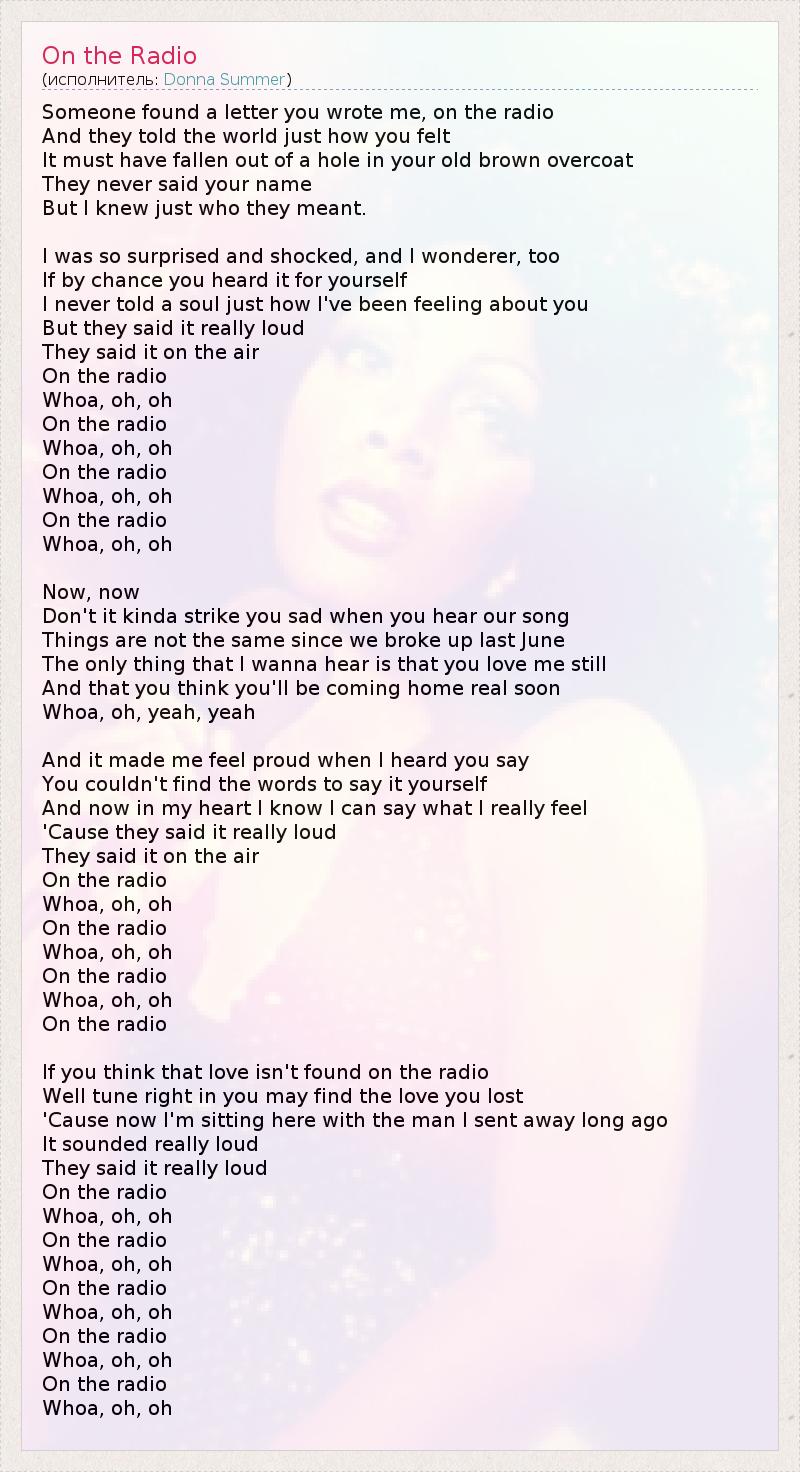 Если вы думаете, что любовь нельзя найти по радио,Что ж, настройте приёмник и, может, найдёте потерянную любовь.Потому что я сейчас сижу рядом с человеком, которого послала давным-давно,Это прозвучало действительного громко,Они произнесли это действительно во всеуслышаниеПо радио!О! О!