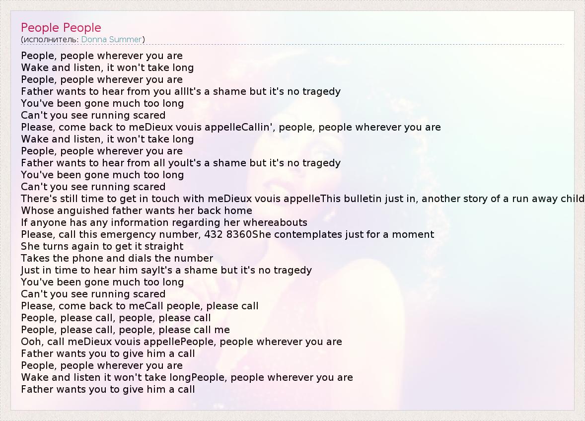 People, people wherever you are Wake and listen, it won't take long People, people wherever you are Father wants to hear from you allIt's a shame but it's no tragedy You've been gone much too long Can't you see running scared Please, come back to meDieux vouis appelleCallin', people, people wherever you are Wake and listen, it won't take long People, people wherever you are Father wants to hear from all youIt's a shame but it's no tragedy You've been gone much too long Can't you see running scared There's still time to get in touch with meDieux vouis appelleThis bulletin just in, another story of a run away child Whose anguished father wants her back home If anyone has any information regarding her whereabouts Please, call this emergency number, 432 8360She contemplates just for a moment She turns again to get it straight Takes the phone and dials the number Just in time to hear him sayIt's a shame but it's no tragedy You've been gone much too long Can't you see running scared Please, come back to meCall people, please call People, please call, people, please call People, please call, people, please call me Ooh, call meDieux vouis appellePeople, people wherever you are Father wants you to give him a call People, people wherever you are Wake and listen it won't take longPeople, people wherever you are Father wants you to give him a call