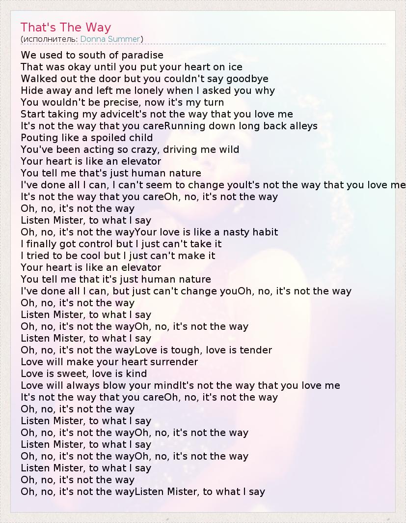 We used to south of paradise That was okay until you put your heart on ice Walked out the door but you couldn't say goodbye Hide away and left me lonely when I asked you why You wouldn't be precise, now it's my turn Start taking my adviceIt's not the way that you love me It's not the way that you careRunning down long back alleys Pouting like a spoiled child You've been acting so crazy, driving me wild Your heart is like an elevator You tell me that's just human nature I've done all I can, I can't seem to change youIt's not the way that you love me It's not the way that you careOh, no, it's not the way Oh, no, it's not the way Listen Mister, to what I say Oh, no, it's not the wayYour love is like a nasty habit I finally got control but I just can't take it I tried to be cool but I just can't make it Your heart is like an elevator You tell me that it's just human nature I've done all I can, but just can't change youOh, no, it's not the way Oh, no, it's not the way Listen Mister, to what I say Oh, no, it's not the wayOh, no, it's not the way Listen Mister, to what I say Oh, no, it's not the wayLove is tough, love is tender Love will make your heart surrender Love is sweet, love is kind Love will always blow your mindIt's not the way that you love me It's not the way that you careOh, no, it's not the way Oh, no, it's not the way Listen Mister, to what I say Oh, no, it's not the wayOh, no, it's not the way Listen Mister, to what I say Oh, no, it's not the wayOh, no, it's not the way Listen Mister, to what I say Oh, no, it's not the way Oh, no, it's not the wayListen Mister, to what I say