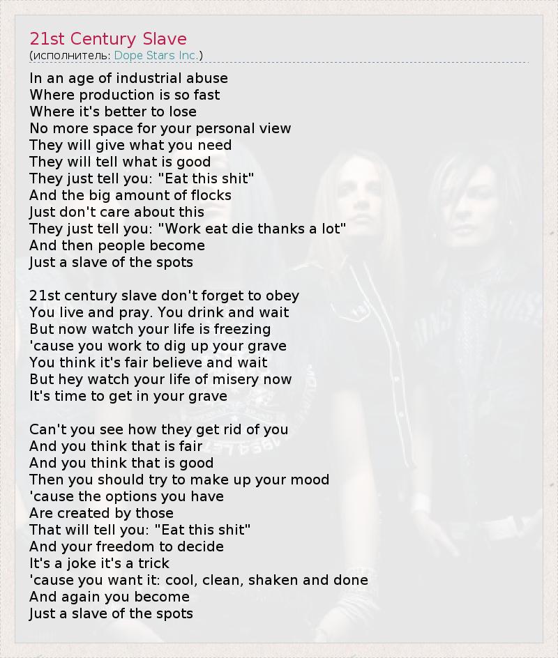 In an age of industrial abuse Where production is so fast Where it's better to lose No more space for your personal view They will give what you need They will tell what is good They just tell you: "Eat this shit" And the big amount of flocks Just don't care about this They just tell you: "Work eat die thanks a lot" And then people become Just a slave of the spots 21st century slave don't forget to obey You live and pray. You drink and wait But now watch your life is freezing 'cause you work to dig up your grave You think it's fair believe and wait But hey watch your life of misery now It's time to get in your grave Can't you see how they get rid of you And you think that is fair And you think that is good Then you should try to make up your mood 'cause the options you have Are created by those That will tell you: "Eat this shit" And your freedom to decide It's a joke it's a trick 'cause you want it: cool, clean, shaken and done And again you become Just a slave of the spots