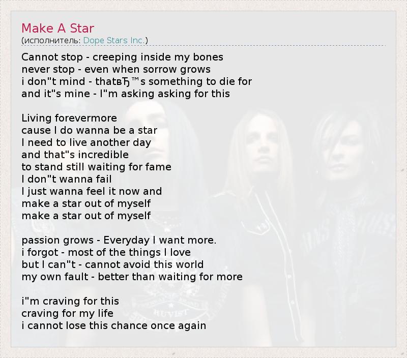 Cannot stop - creeping inside my bones never stop - even when sorrow grows i don"t mind - that’s something to die for and it"s mine - I"m asking asking for this Living forevermore cause I do wanna be a star I need to live another day and that"s incredible to stand still waiting for fame I don"t wanna fail I just wanna feel it now and make a star out of myself make a star out of myself passion grows - Everyday I want more. i forgot - most of the things I love but I can"t - cannot avoid this world my own fault - better than waiting for more i"m craving for this craving for my life i cannot lose this chance once again