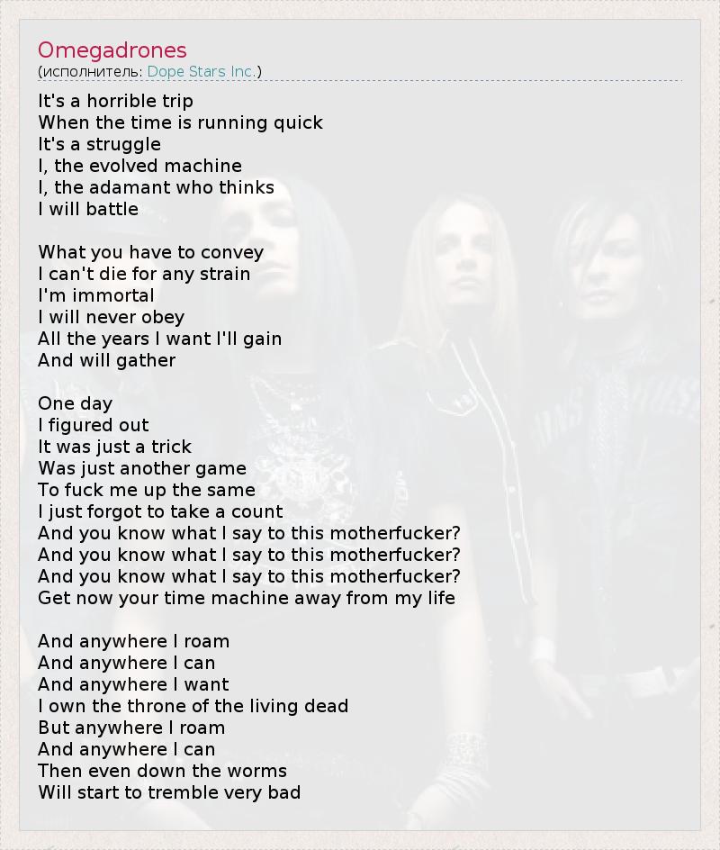 It's a horrible trip When the time is running quick It's a struggle I, the evolved machine I, the adamant who thinks I will battle What you have to convey I can't die for any strain I'm immortal I will never obey All the years I want I'll gain And will gather One day I figured out It was just a trick Was just another game To fuck me up the same I just forgot to take a count And you know what I say to this motherfucker? And you know what I say to this motherfucker? And you know what I say to this motherfucker? Get now your time machine away from my life And anywhere I roam And anywhere I can And anywhere I want I own the throne of the living dead But anywhere I roam And anywhere I can Then even down the worms Will start to tremble very bad