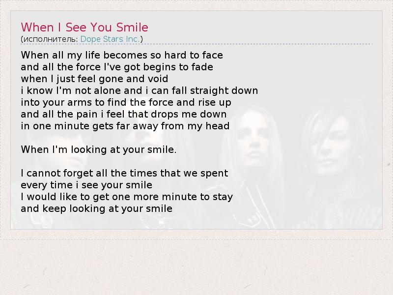 Когда Я Вижу Твою Улыбку Когда мне становится тяжело, И вся сила, что была, начинает пропадать, Когда я чувствую только слабость и бессилие, Я знаю, что не один и могу упасть В твои объятья, чтобы вновь обрести силу и восстать... Вся та боль, которая тянула меня вниз, В одну минуту уносится прочь... ...когда я смотрю, как ты улыбаешься.... Я не могу забыть все то время, которое мы провели вместе. Каждый раз, когда я вижу твою улыбку, Я хочу остаться еще на одну минуту И продолжить смотреть на твою улыбку.