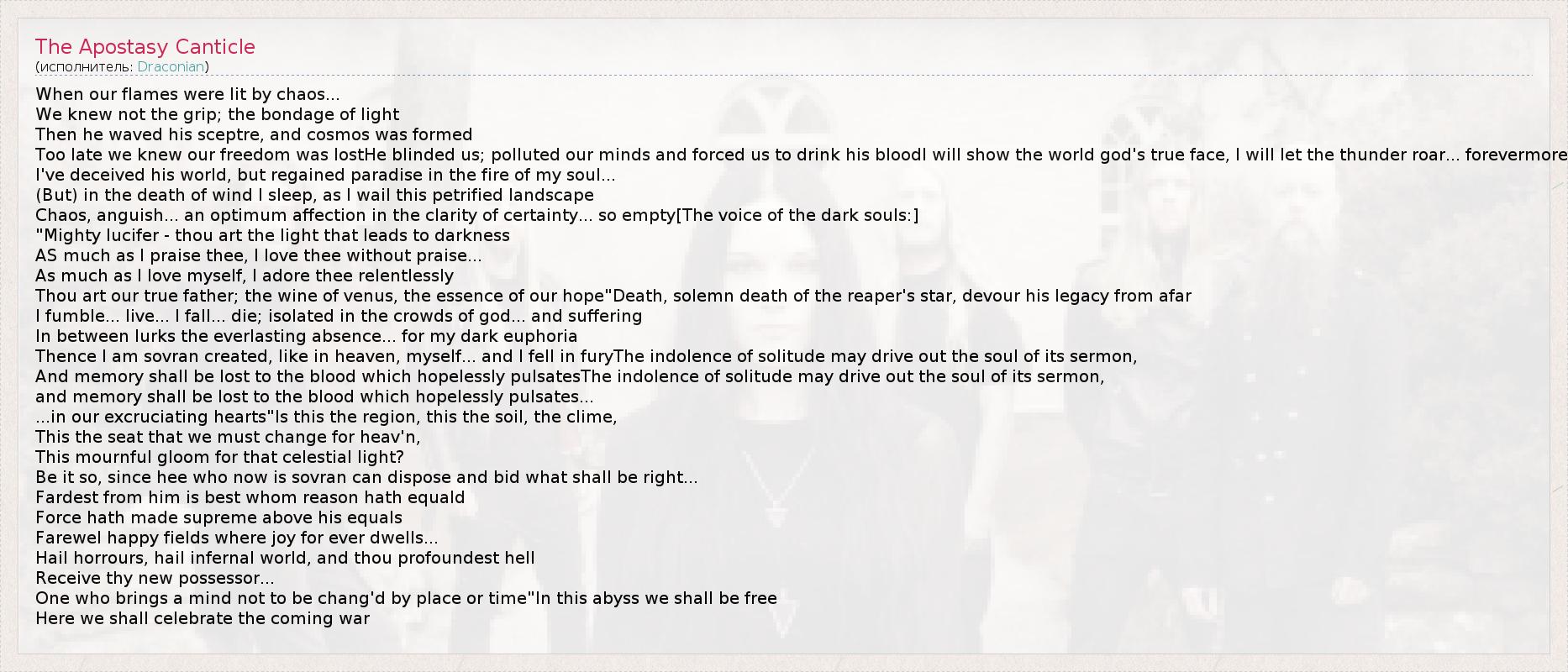 When our flames were lit by chaos... We knew not the grip; the bondage of light Then he waved his sceptre, and cosmos was formed Too late we knew our freedom was lostHe blinded us; polluted our minds and forced us to drink his bloodI will show the world god's true face, I will let the thunder roar... forevermore I've deceived his world, but regained paradise in the fire of my soul... (But) in the death of wind I sleep, as I wail this petrified landscape Chaos, anguish... an optimum affection in the clarity of certainty... so empty[The voice of the dark souls:] "Mighty lucifer - thou art the light that leads to darkness AS much as I praise thee, I love thee without praise... As much as I love myself, I adore thee relentlessly Thou art our true father; the wine of venus, the essence of our hope"Death, solemn death of the reaper's star, devour his legacy from afar I fumble... live... I fall... die; isolated in the crowds of god... and suffering In between lurks the everlasting absence... for my dark euphoria Thence I am sovran created, like in heaven, myself... and I fell in furyThe indolence of solitude may drive out the soul of its sermon, And memory shall be lost to the blood which hopelessly pulsatesThe indolence of solitude may drive out the soul of its sermon, and memory shall be lost to the blood which hopelessly pulsates... ...in our excruciating hearts"Is this the region, this the soil, the clime, This the seat that we must change for heav'n, This mournful gloom for that celestial light? Be it so, since hee who now is sovran can dispose and bid what shall be right... Fardest from him is best whom reason hath equald Force hath made supreme above his equals Farewel happy fields where joy for ever dwells... Hail horrours, hail infernal world, and thou profoundest hell Receive thy new possessor... One who brings a mind not to be chang'd by place or time"In this abyss we shall be free Here we shall celebrate the coming war