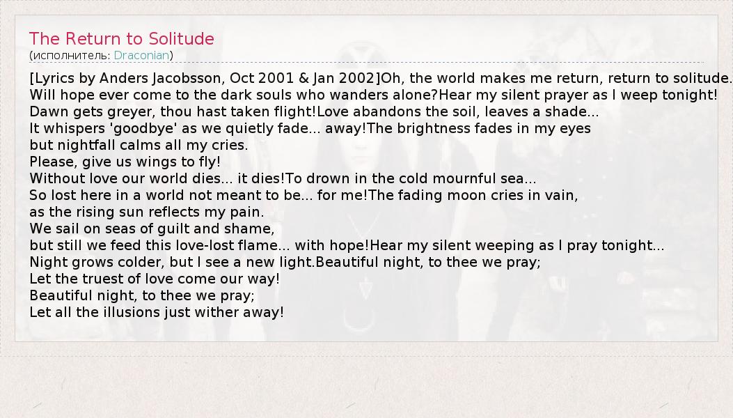 [Lyrics by Anders Jacobsson, Oct 2001 & Jan 2002]Oh, the world makes me return, return to solitude.