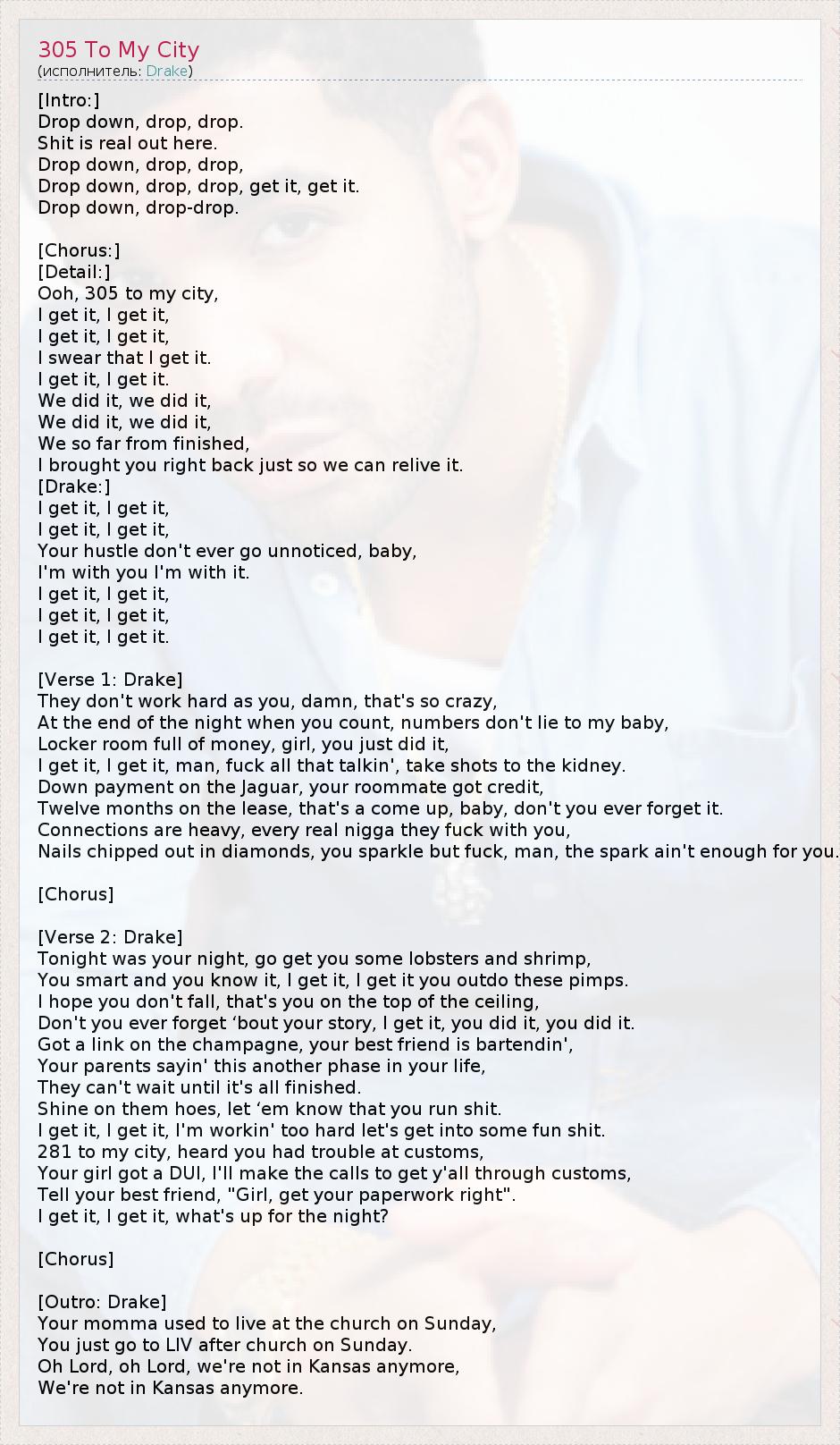 [Intro:] Drop down, drop, drop. Shit is real out here. Drop down, drop, drop, Drop down, drop, drop, get it, get it. Drop down, drop-drop. [Chorus:] [Detail:] Ooh, 305 to my city, I get it, I get it, I get it, I get it, I swear that I get it. I get it, I get it. We did it, we did it, We did it, we did it, We so far from finished, I brought you right back just so we can relive it. [Drake:] I get it, I get it, I get it, I get it, Your hustle don't ever go unnoticed, baby, I'm with you I'm with it. I get it, I get it, I get it, I get it, I get it, I get it. [Verse 1: Drake] They don't work hard as you, damn, that's so crazy, At the end of the night when you count, numbers don't lie to my baby, Locker room full of money, girl, you just did it, I get it, I get it, man, fuck all that talkin', take shots to the kidney. Down payment on the Jaguar, your roommate got credit, Twelve months on the lease, that's a come up, baby, don't you ever forget it. Connections are heavy, every real nigga they fuck with you, Nails chipped out in diamonds, you sparkle but fuck, man, the spark ain't enough for you. [Chorus] [Verse 2: Drake] Tonight was your night, go get you some lobsters and shrimp, You smart and you know it, I get it, I get it you outdo these pimps. I hope you don't fall, that's you on the top of the ceiling, Don't you ever forget ‘bout your story, I get it, you did it, you did it. Got a link on the champagne, your best friend is bartendin', Your parents sayin' this another phase in your life, They can't wait until it's all finished. Shine on them hoes, let ‘em know that you run shit. I get it, I get it, I'm workin' too hard let's get into some fun shit. 281 to my city, heard you had trouble at customs, Your girl got a DUI, I'll make the calls to get y'all through customs, Tell your best friend, "Girl, get your paperwork right". I get it, I get it, what's up for the night? [Chorus] [Outro: Drake] Your momma used to live at the church on Sunday, You just go to LIV after church on Sunday. Oh Lord, oh Lord, we're not in Kansas anymore, We're not in Kansas anymore.