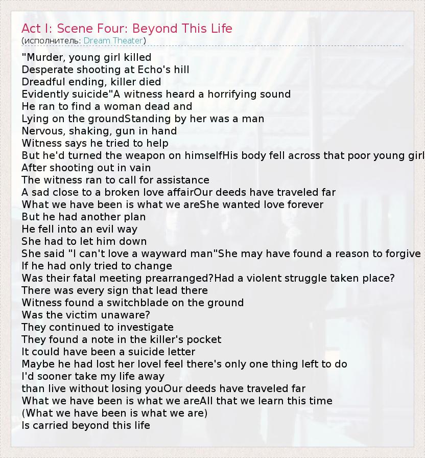 А как ты думаешь, о чем песня "Act I: Scene Four: Beyond This Life" ?