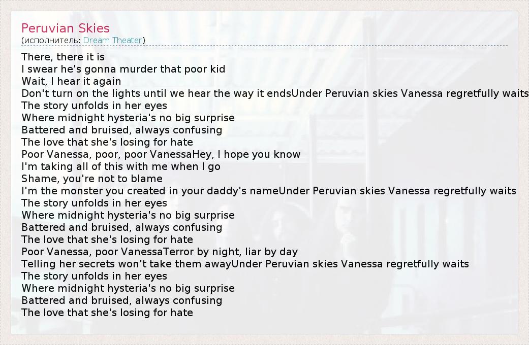 А как ты думаешь, о чем песня "Peruvian Skies" ?