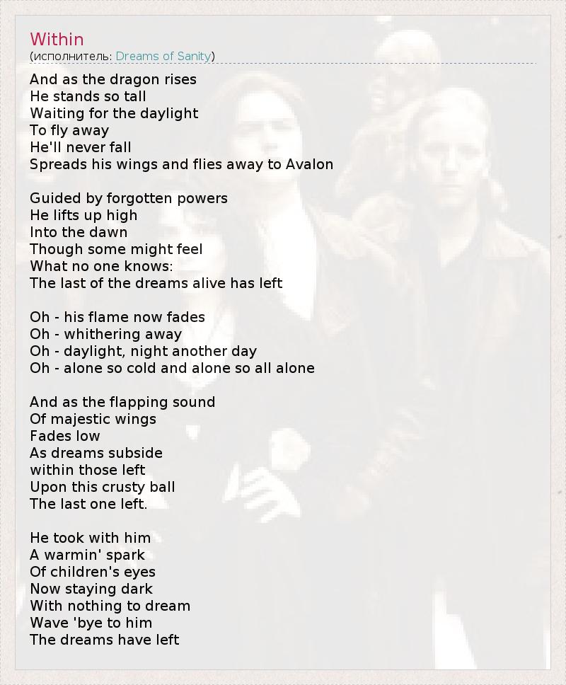 Это интересно:Dreams of Sanity (приблизительный перевод - "Сны здравого ума") как группа была сформирована в далеком 1991 году в городе Инсбрук, Австрия. В первоначальном составе было всего три участника - барабанщик Ромед Астнер (Romed Astner), гитарист, поэт и основной вдохновитель Кристиан Маркс (Christian Marx) и басист Майкл Кнофлах (Michael Knoflach). Основной идеей новообразовавшегося коллектива было создать другое звучание,... продолжение