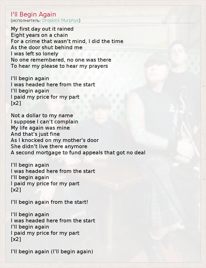 My first day out it rained Eight years on a chain For a crime that wasn't mind, I did the time As the door shut behind me I was left so lonely No one remembered, no one was there To hear my please to hear my prayers I'll begin again I was headed here from the start I'll begin again I paid my price for my part [x2] Not a dollar to my name I suppose I can't complain My life again was mine And that's just fine As I knocked on my mother's door She didn't live there anymore A second mortgage to fund appeals that got no deal I'll begin again I was headed here from the start I'll begin again I paid my price for my part [x2] I'll begin again from the start! I'll begin again I was headed here from the start I'll begin again I paid my price for my part [x2] I'll begin again (I'll begin again)