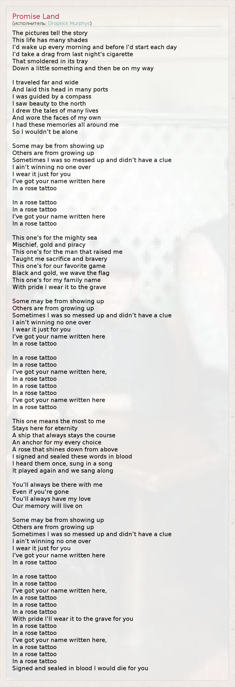 The pictures tell the story This life has many shades I'd wake up every morning and before I'd start each day I'd take a drag from last night's cigarette That smoldered in its tray Down a little something and then be on my way I traveled far and wide And laid this head in many ports I was guided by a compass I saw beauty to the north I drew the tales of many lives And wore the faces of my own I had these memories all around me So I wouldn't be alone Some may be from showing up Others are from growing up Sometimes I was so messed up and didn't have a clue I ain't winning no one over I wear it just for you I've got your name written here In a rose tattoo In a rose tattoo In a rose tattoo I've got your name written here In a rose tattoo This one's for the mighty sea Mischief, gold and piracy This one's for the man that raised me Taught me sacrifice and bravery This one's for our favorite game Black and gold, we wave the flag This one's for my family name With pride I wear it to the grave Some may be from showing up Others are from growing up Sometimes I was so messed up and didn't have a clue I ain't winning no one over I wear it just for you I've got your name written here In a rose tattoo In a rose tattoo In a rose tattoo I've got your name written here, In a rose tattoo In a rose tattoo In a rose tattoo I've got your name written here In a rose tattoo This one means the most to me Stays here for eternity A ship that always stays the course An anchor for my every choice A rose that shines down from above I signed and sealed these words in blood I heard them once, sung in a song It played again and we sang along You'll always be there with me Even if you're gone You'll always have my love Our memory will live on Some may be from showing up Others are from growing up Sometimes I was so messed up and didn't have a clue I ain't winning no one over I wear it just for you I've got your name written here In a rose tattoo In a rose tattoo In a rose tattoo I've got your name written here, In a rose tattoo In a rose tattoo In a rose tattoo With pride I'll wear it to the grave for you In a rose tattoo In a rose tattoo I've got your name written here, In a rose tattoo In a rose tattoo In a rose tattoo Signed and sealed in blood I would die for you