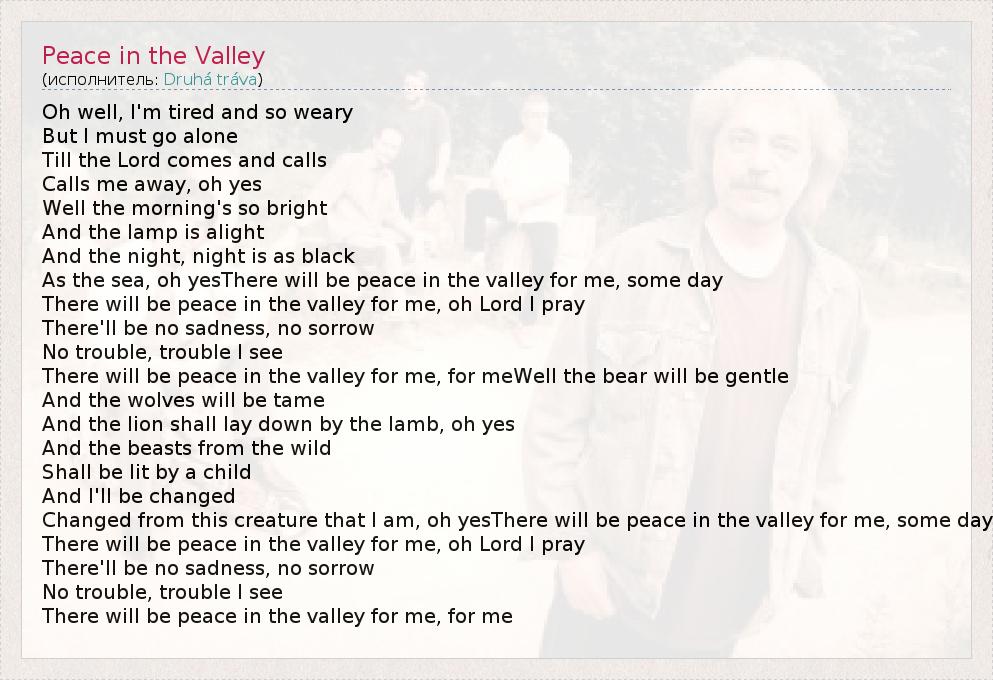 Oh well, I'm tired and so weary But I must go alone Till the Lord comes and calls Calls me away, oh yes Well the morning's so bright And the lamp is alight And the night, night is as black As the sea, oh yesThere will be peace in the valley for me, some day There will be peace in the valley for me, oh Lord I pray There'll be no sadness, no sorrow No trouble, trouble I see There will be peace in the valley for me, for meWell the bear will be gentle And the wolves will be tame And the lion shall lay down by the lamb, oh yes And the beasts from the wild Shall be lit by a child And I'll be changed Changed from this creature that I am, oh yesThere will be peace in the valley for me, some day There will be peace in the valley for me, oh Lord I pray There'll be no sadness, no sorrow No trouble, trouble I see There will be peace in the valley for me, for me