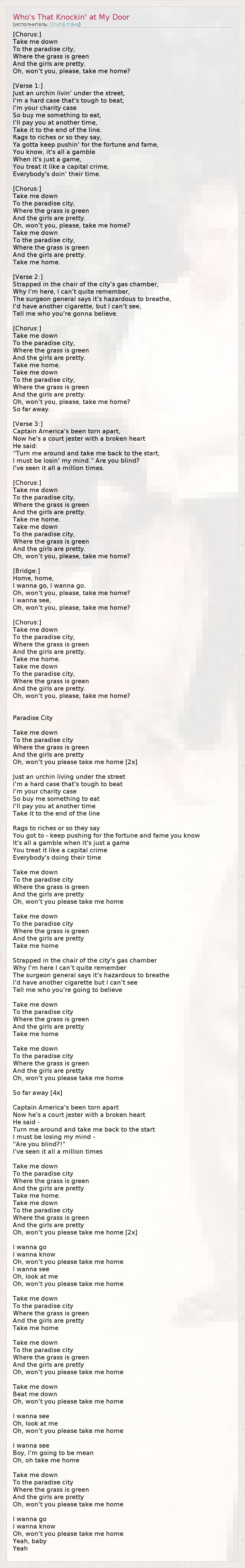 ГлавнаяИсполнителиDruhá trávaWho's That Knockin' at My Door