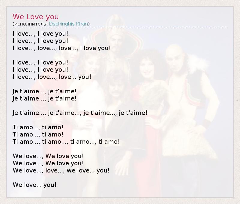 I love..., I love you! I love..., I love you! I love..., love..., love..., I love you! I love..., I love you! I love..., I love you! I love..., love..., love... you! Je t'aime..., je t'aime! Je t'aime..., je t'aime! Je t'aime..., je t'aime..., je t'aime..., je t'aime! Ti amo..., ti amo! Ti amo..., ti amo! Ti amo..., ti amo..., ti amo..., ti amo! We love..., We love you! We love..., We love you! We love..., love..., we love... you! We love... you!