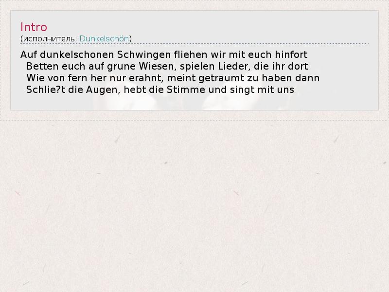 Это интересно:Группа была образована в 2006 году в Германии, свой стиль определяют, как Medieval Celtic Folk.Состав группы:Vanessa Istvan – Вокал, флейтаMichael Kaiser – Вокал, Гитары, Бас, ПеркуссииChristian Witt Kopf – Перкуссии, КалимбаMonika Klüpfel - ВиолончельNicolas von Stolzmann - Гитара, Ирландская греческая гитараAndré Straub - УдарныеПрошлые:Brother Bjoern – Гитара, Вокал, Бас, МандолинаНезависимый... продолжение